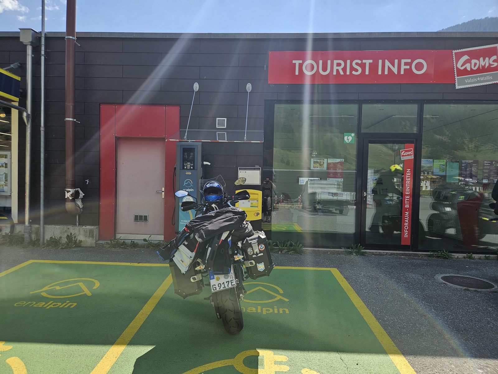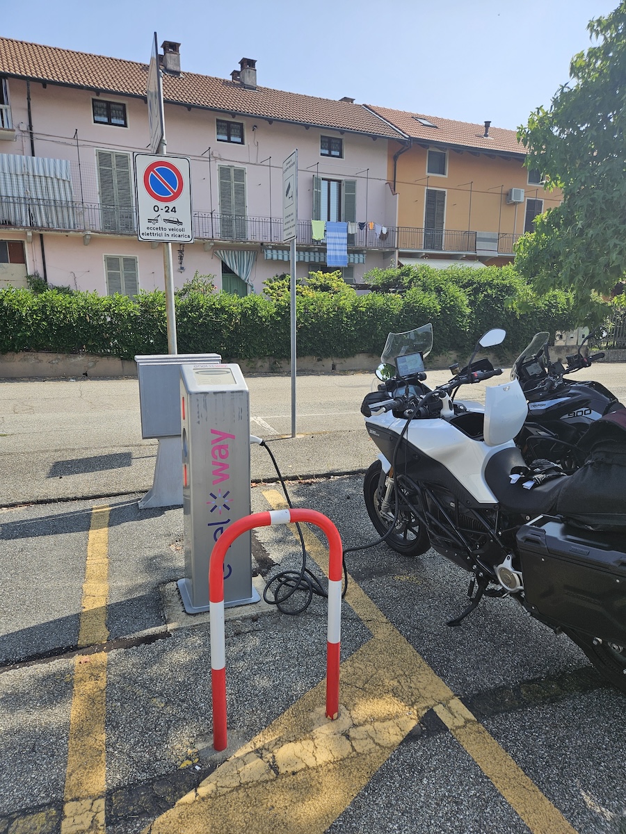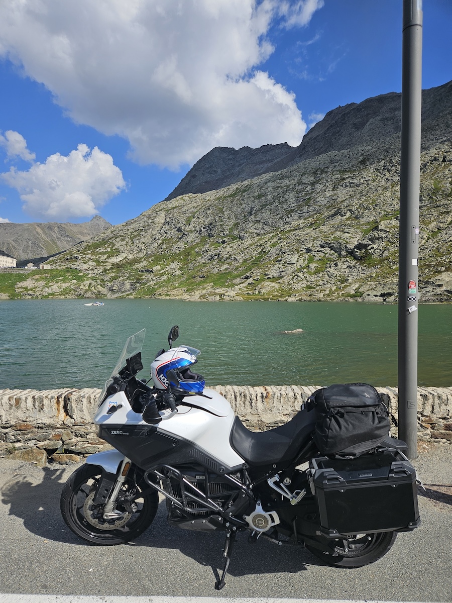 Die Rückreise begann. Bis auf einen kurzen Abstecher Richtung Grand Villa blieb ich nahe der Autobahn und fuhr schließlich bis Quincinetto tatsächlich auf der Autobahn. Danach wurde es wieder kleinräumig und kurvig: über viele Dörfer nach Biella und Omegna. Die Zero war fast leer, also nutzte ich einen zweistündigen Ladestopp für Pizza und ein Bad im Lago d’Orta. Weiter ging es nach Domodossola – mit einem Stück Schnellstraße –, dann über den Simplonpassmit Halt am alten Simplon-Hospiz hinunter nach Brig. Dort zickte die Ladesäule, und für einen Bummel durch die Altstadt war es bereits zu spät.