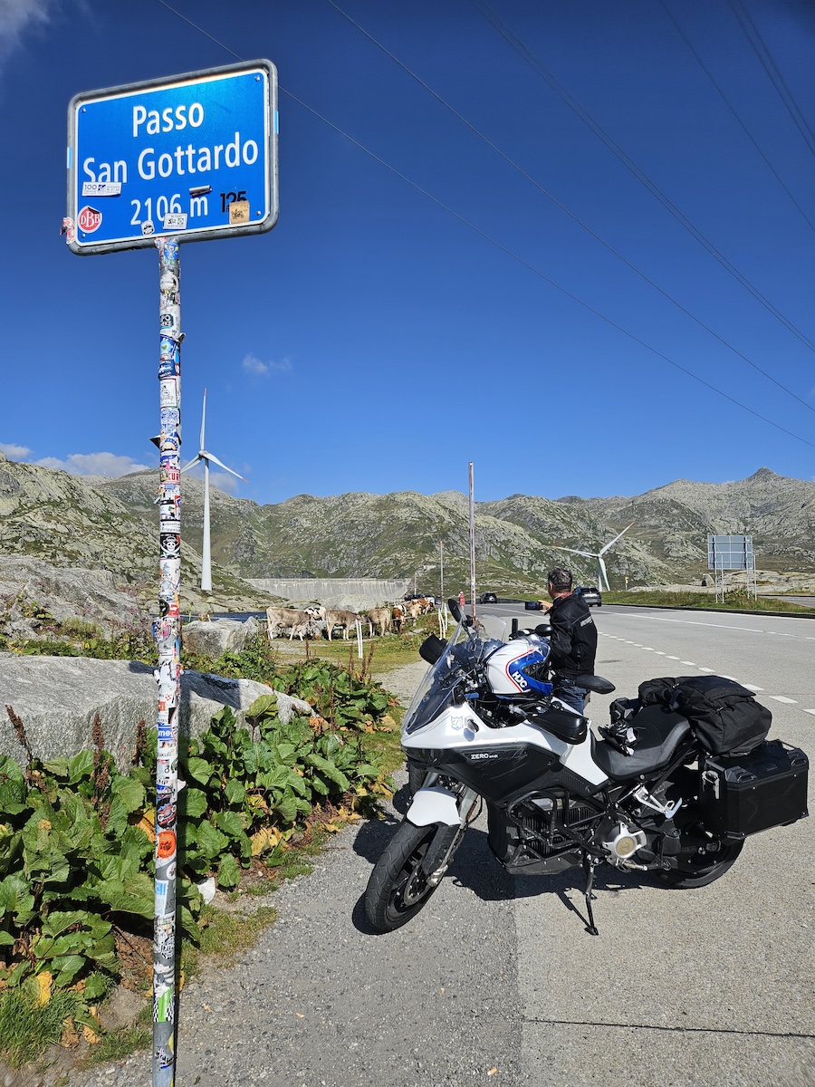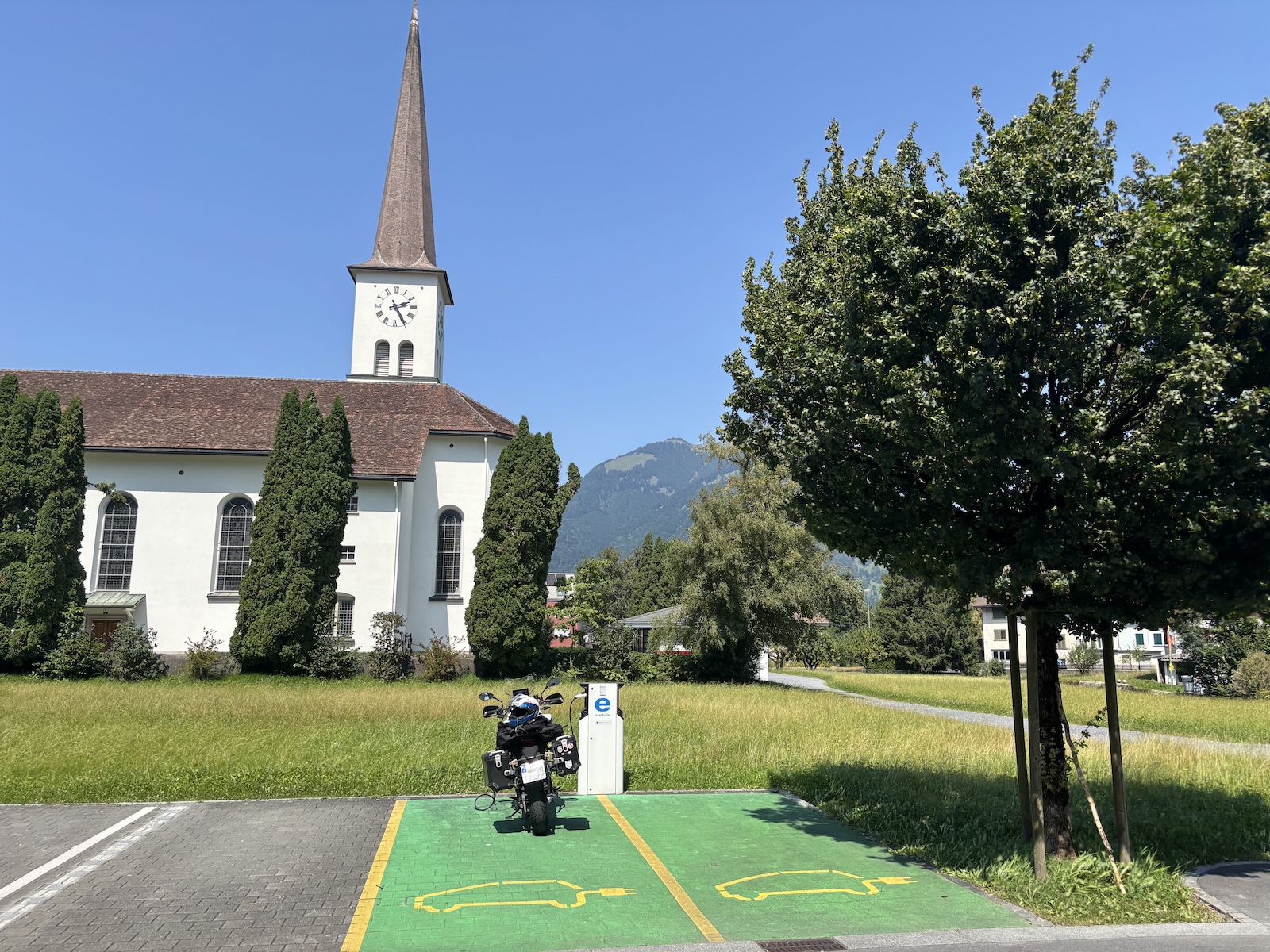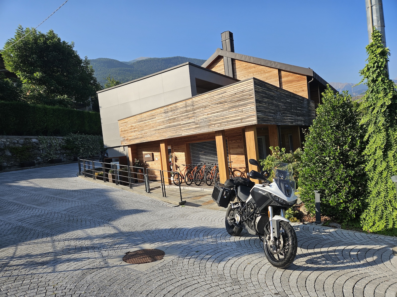 Die Rückreise begann. Bis auf einen kurzen Abstecher Richtung Grand Villa blieb ich nahe der Autobahn und fuhr schließlich bis Quincinetto tatsächlich auf der Autobahn. Danach wurde es wieder kleinräumig und kurvig: über viele Dörfer nach Biella und Omegna. Die Zero war fast leer, also nutzte ich einen zweistündigen Ladestopp für Pizza und ein Bad im Lago d’Orta. Weiter ging es nach Domodossola – mit einem Stück Schnellstraße –, dann über den Simplonpassmit Halt am alten Simplon-Hospiz hinunter nach Brig. Dort zickte die Ladesäule, und für einen Bummel durch die Altstadt war es bereits zu spät.
