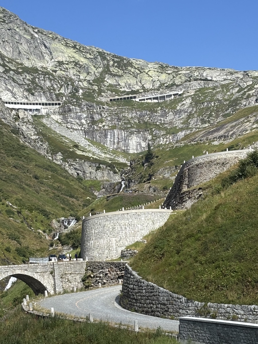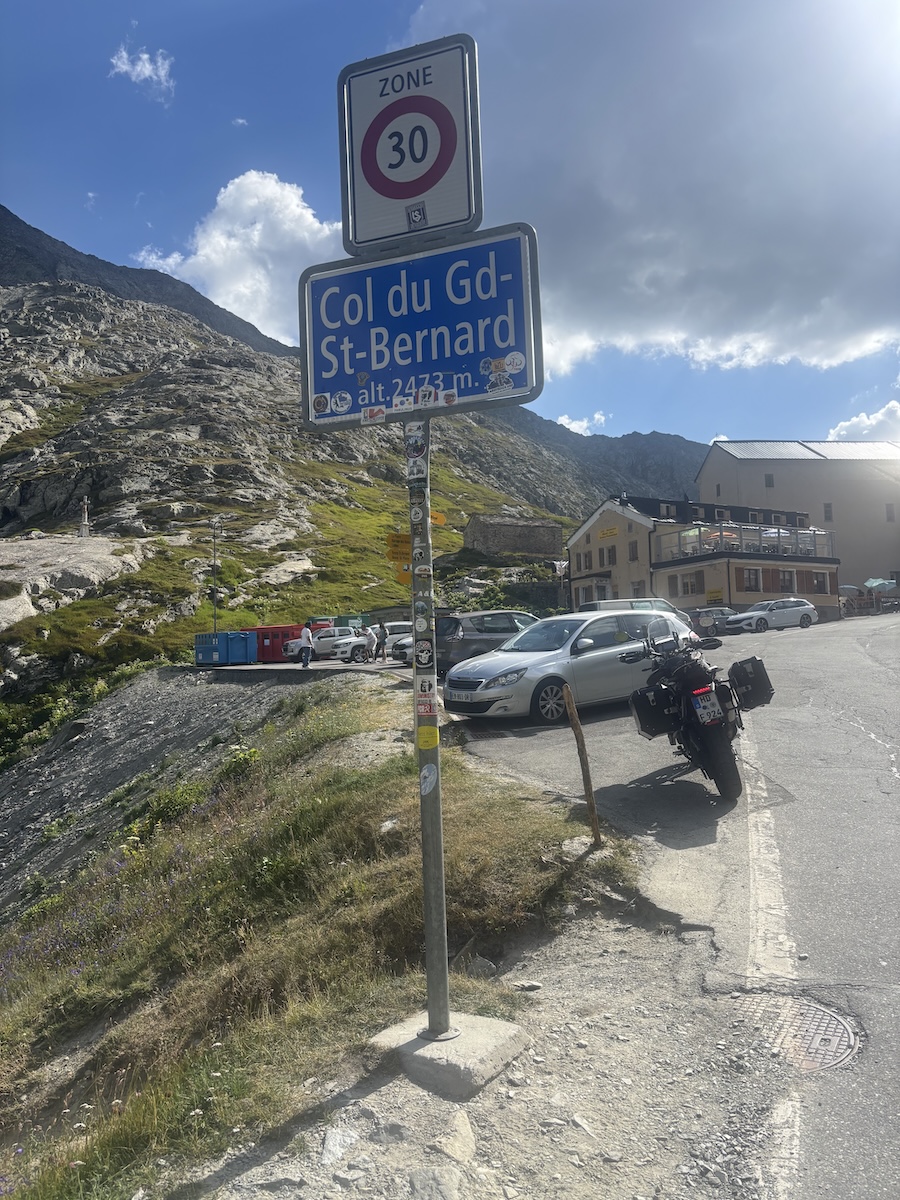 Am Morgen nahm ich den Oberalppass zurück nach Andermatt, fuhr weiter zum Gotthardpass und über die historische Tremola hinab. Am Nufenenpass gab es am Ende der Passstraße eine Ladepause mit Kaffee und Sandwich. Die Strecke bis Martigny zog sich – beim nächsten Mal besser die Autobahn statt der Dorfstraßen. Nach einem weiteren Ladestopp ging es hinauf zum Großen St. Bernhard und hinab ins Aostatal.