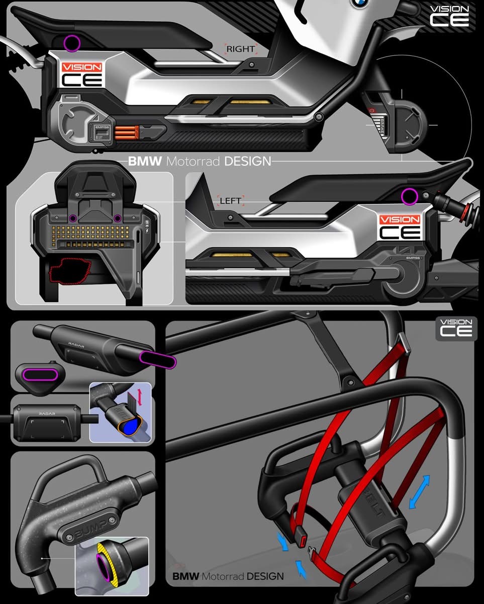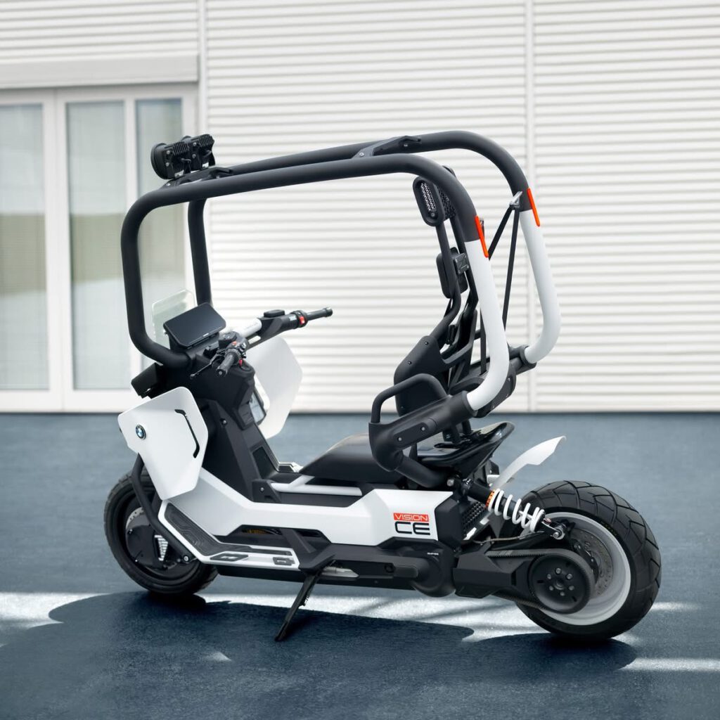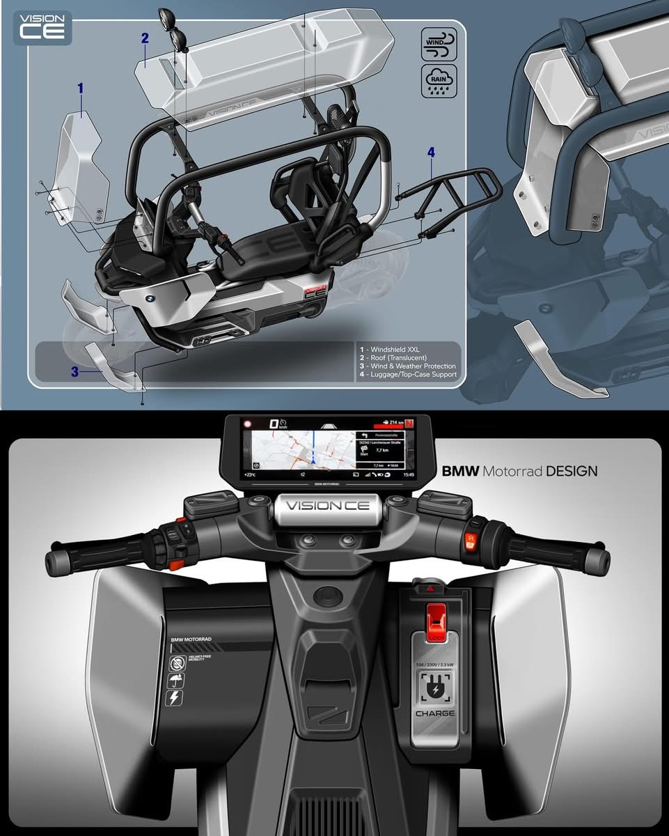 Für den Vision CE ist eine A1-/B196-fähige Variante mit 11 kW Dauerleistung denkbar, was jüngeren Fahrer:innen den Zugang erleichtert. Auch beim Dachdesign bleibt BMW flexibel: offen, geschlossen oder speziell für Angler und Camper – alles ist möglich.
