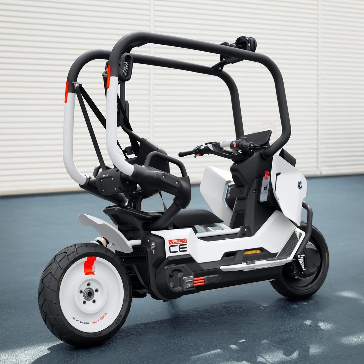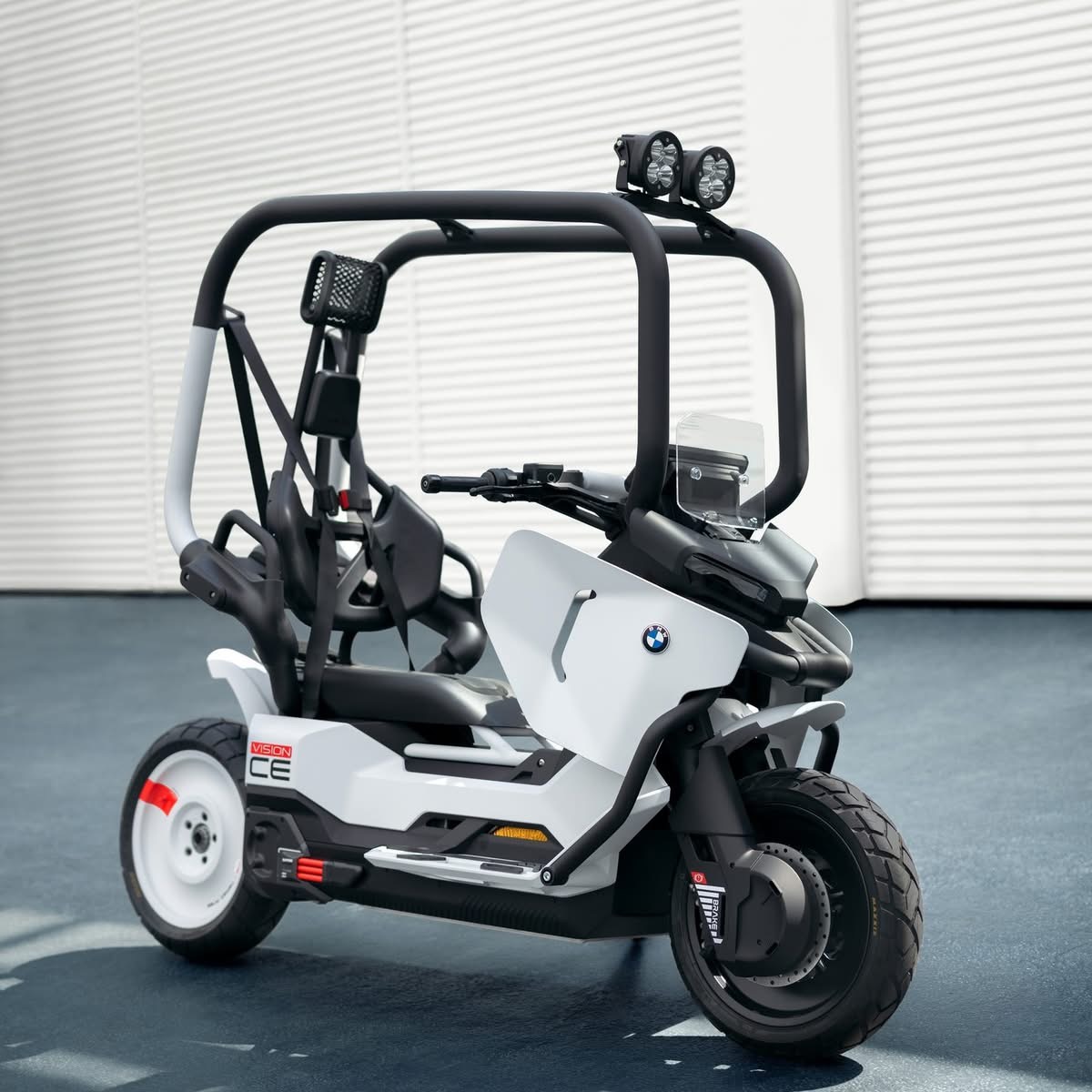 Der Vision CE ist funktional und ein echter Hingucker: gestreckter Radstand, markante 15-Zoll-Scheibenräder und niedrige Dachlinie prägen eine unverwechselbare Silhouette. Minimalistisches Schwarz-Weiß-Farbkonzept, Aluminium-Materialien und leuchtrote Akzente betonen den Hightech-Charakter. Inspiriert vom Beach Buggyvermittelt der Käfig Sicherheit ohne einzuengen – robust, aber urban und stylisch.