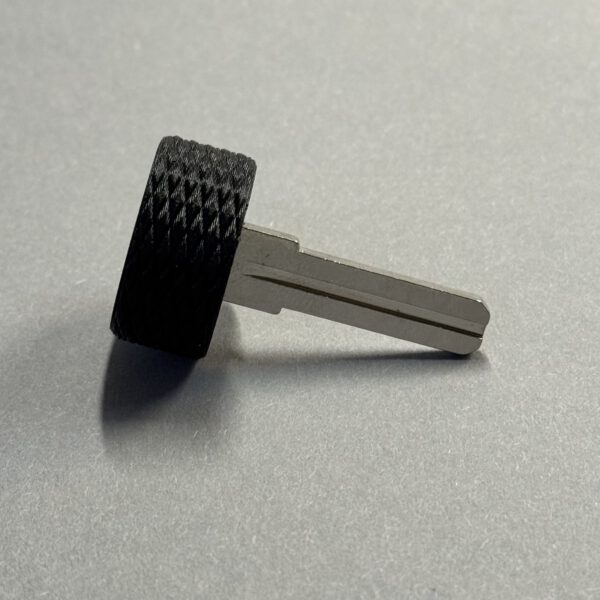 Der gefräste Rohling wird so in das Schloss vom Staufach gesteckt, dass das Fach damit aufgeschlossen werden kann. Dann kommt das Abstandshalter-Plättchen über den Schlüssel und anschließend der Knauf auf den Schlüssel. Idealerweise habt Ihr vorher in die Nut des Knaufs etwas flexiblen Kleber eingebracht – nicht zu viel, damit kein Kleber ins Schloss gelangt.
