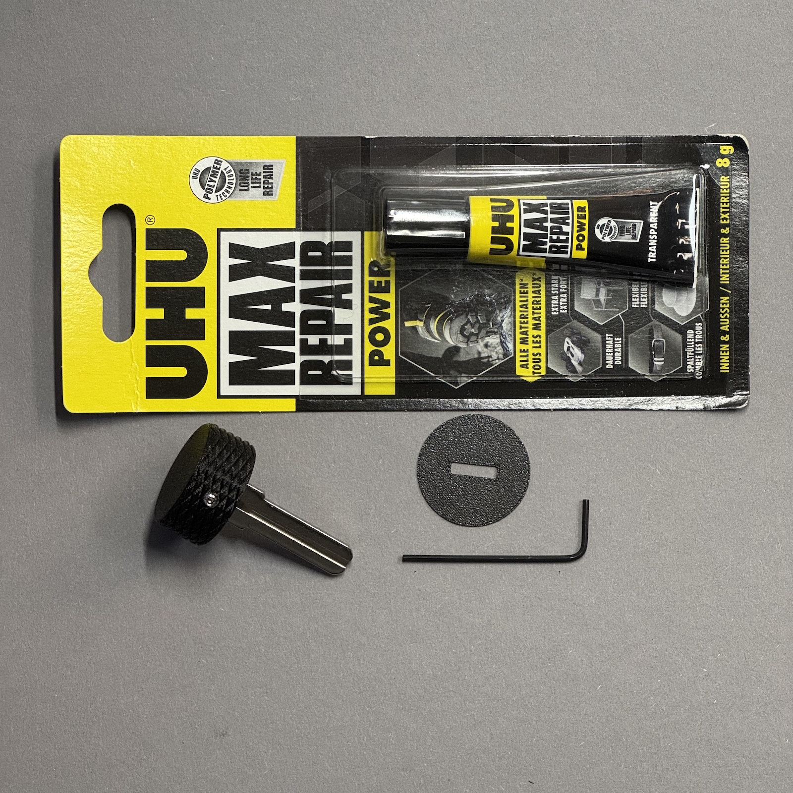 Flexibler Kleber, empfohlen zur zusätzlichen Sicherung des #SteckerBiker-Schlüsseldings (separat zu ordern, nicht im Lieferumfang enthalten):