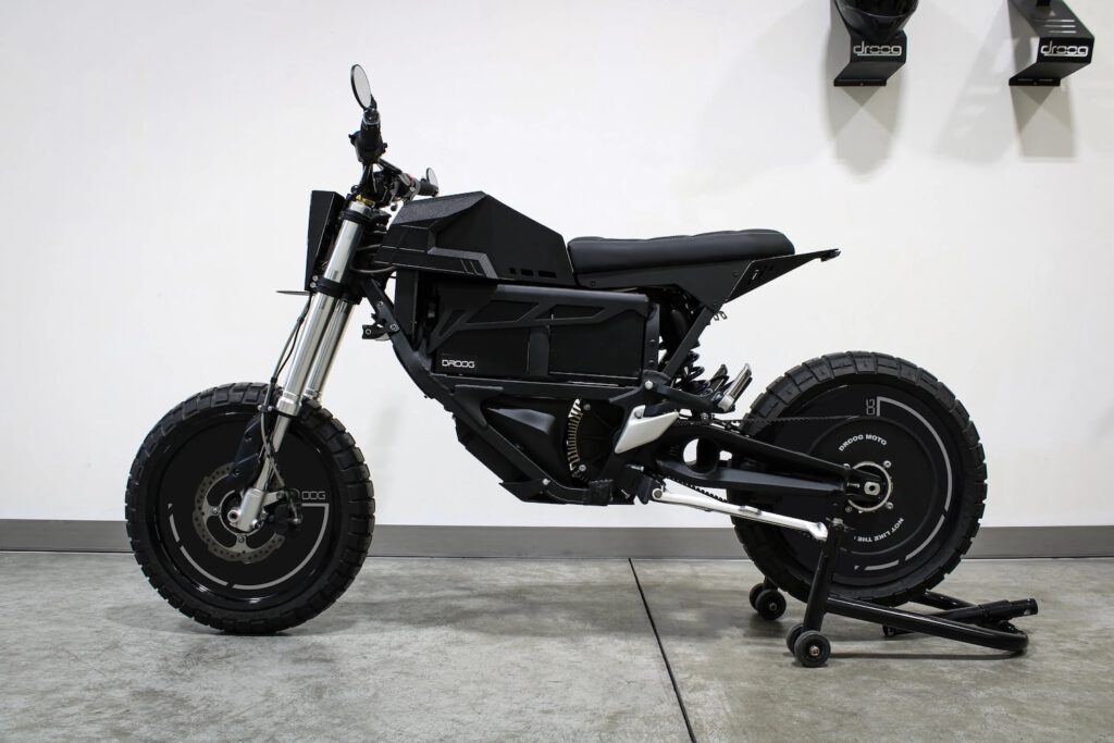 Der Rahmen und die Verkleidungsteile sind so gestaltet, dass Technik sichtbar bleibt. Kabel, Batteriegehäuse und Motor sind kein verstecktes Beiwerk, sondern Teil des Designs. Droog Moto spricht hier selbst von „Electric Brutalism“ – rohe Technik, bewusst gezeigt und nicht verkleidet.